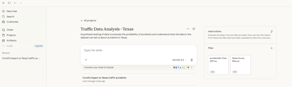Using the Claude desktop client we’ll now get our hypothesis tested. Using the desktop client you have the ability to upload data to a project, and then query that dataset within the project. The interface is intuitive and extremely straightforward. No tagging or explaining of the dataset was done to produce the output. Just upload the data, and prompt the model.