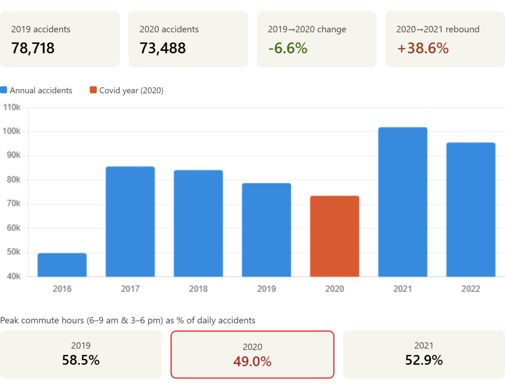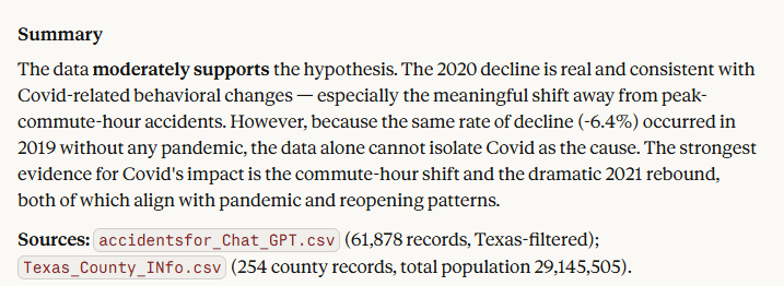 “You are an analyst who has been provided traffic datasets for Texas. These tell us by date and time how many traffic accidents occurred in Texas. I would like you to provide a response that supports or rejects this hypothesis: Traffic accidents were lower in 2020 due to Covid.”