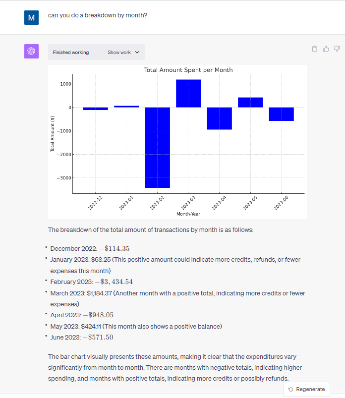 As you can see based upon the above prompt and response, Chat GPT arrived at the same conclusion we did with our Tableau dashboard with about 10% of the effort. No visualization, no pivot table creation and interpretation. Chat GPT did not catch the anomaly in the data however.