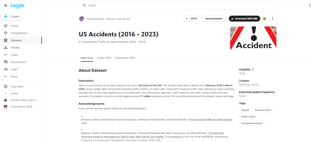 - Moosavi, Sobhan, Mohammad Hossein Samavatian, Srinivasan Parthasarathy, and Rajiv Ramnath. “A Countrywide Traffic Accident Dataset.”, 2019.