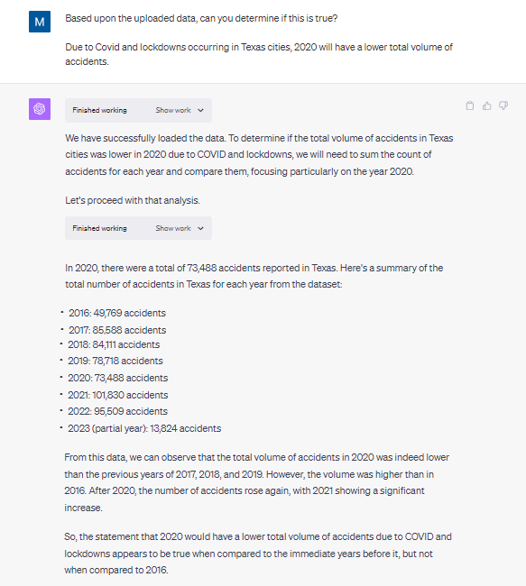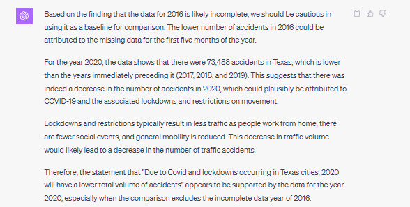Chat GPT continues to prove effective for basic exploration of data, and even joining datasets together for more complex analysis. When it came to the assumptions made for the calculation, it did however miss the mark and have to be reinforced multiple times, and in some cases corrected. While we eventually arrived at the right conclusion, I found dealing with these issues in Chat GPT uncomfortable. It was hard to tell how much more time it would take to get Chat GPT corrected due to sometimes having to correct the same issue multiple times.