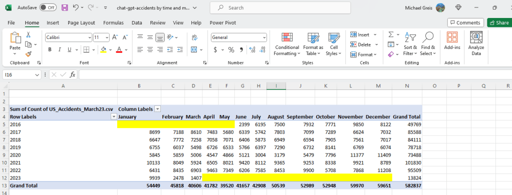 Looking at the dashboard, we can see 2020 is the third lowest in accidents. This raises the question, why do 2016 and 2023 have such low rates of accidents? What we’ll be looking for is any large gaps/inconsistencies in the data.