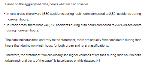 We start by uploading the two datasets, and having Chat GPT featurize the county information to identify whether a county is urban or rural. After that, it’s as easy as asking the questions and getting the response. The data is already joined together correctly using the county column from both datasets.