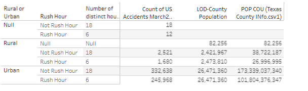 - I had to create quite a few calculated fields and an LOD expression to handle the join between the accident data and the county information (different granularity).